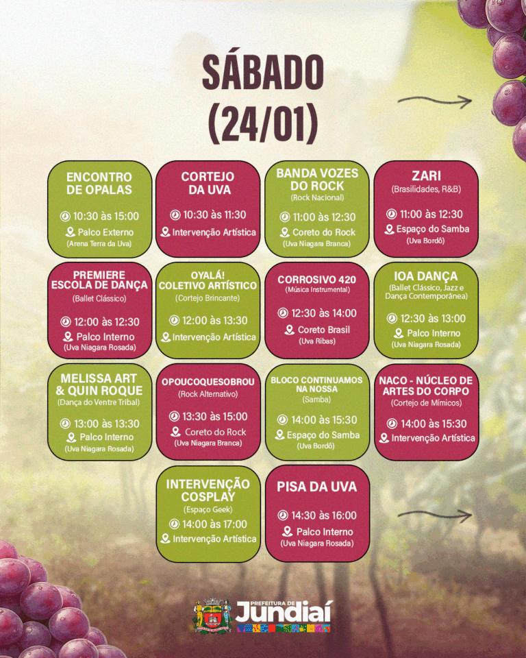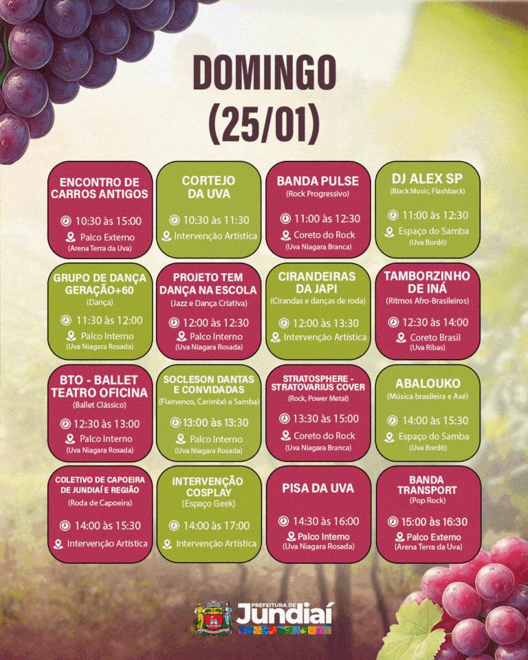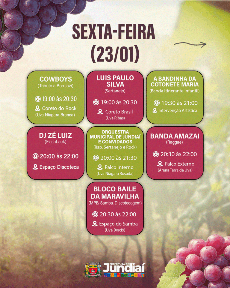 A programação gratuita da 41ª Festa da Uva e 12ª Expo Vinhos segue nos dias 23, 24 e 25 de janeiro; 30 e 31 de janeiro; e 1º, 6, 7 e 8 de fevereiro de 2026, com atrações culturais, experiências gastronômicas e atividades para toda a família.