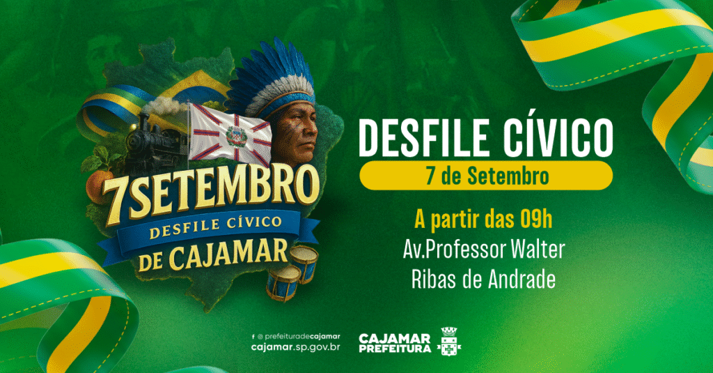A Secretaria de Comunicação e Gestão de Eventos convida toda a população de Cajamar a se reunir na Avenida Professor Walter Ribas de Andrade para prestigiar esse ato cívico. Chegue cedo para garantir um bom lugar e venha com energia para torcer, aplaudir e se emocionar! 📸 Não esqueça de registrar o momento e compartilhar nas redes com a hashtag #Cajamar7deSetembro.