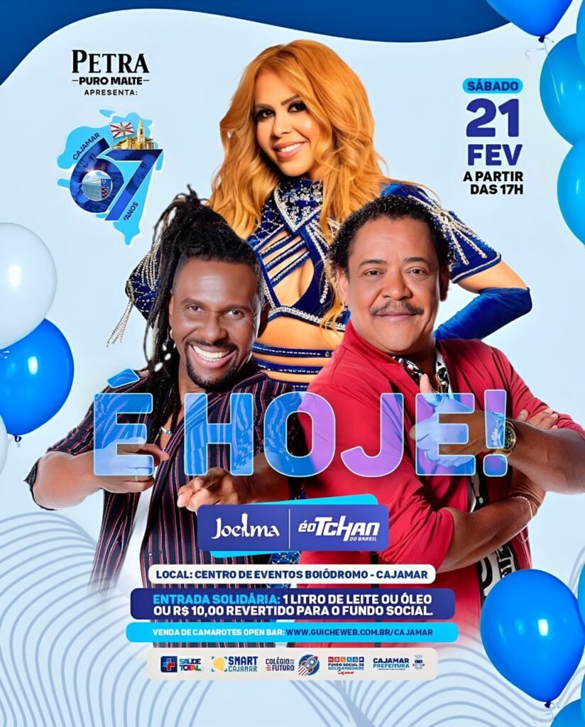 Cajamar, SP – É hoje! Neste sábado, 21 de fevereiro de 2026, a cidade de Cajamar entra em clima de festa máxima para comemorar seus 67 anos de emancipação político-administrativa. A partir das 17h, o Centro de Eventos Boiódromo se transforma no epicentro da celebração, com shows imperdíveis de Joelma e É o Tchan, final do Concurso Rainha de Cajamar, praça de alimentação variada e forte apelo solidário. O evento, organizado pela Prefeitura Municipal, já é considerado o maior já realizado no município e promete reunir milhares de moradores e visitantes da região.