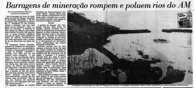 “Taboca dumps waste in the Pitinga, and this has caused much illness (…). When our people eat the fish, they fall ill,” reads a 1986 letter signed by two Kinja leaders. In 1987, headlines in Folha de S.Paulo chronicled the collapse of nine dams—runoff from the disaster reached the Alalaú and Tiaraju rivers, “whose turbid waters threaten the Amazon’s flora and fauna.”