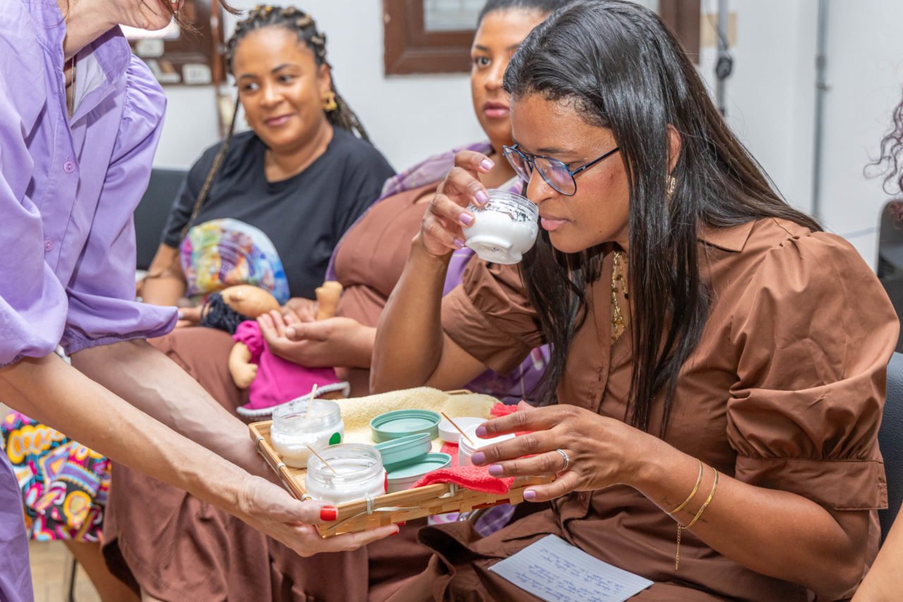 As participantes vivenciaram também a oficina “Toque Aromático”, conduzida pela equipe da Saúde, com massagem nas mãos e aromaterapia, como um momento de autocuidado. A dinâmica simbolizou o reconhecimento da sobrecarga física e emocional vivida por muitas mães negras, cujas mãos representam trabalho, cuidado e resistência.