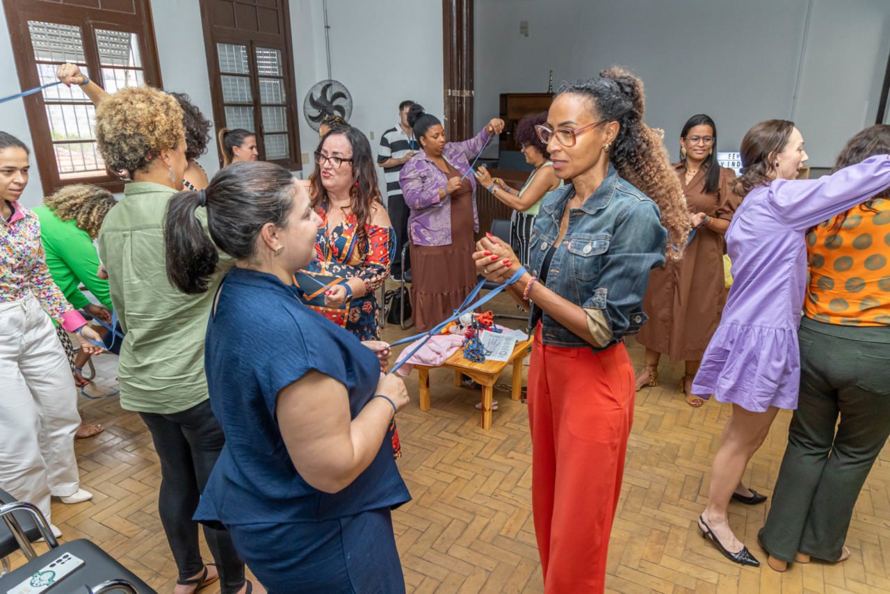 Outro momento marcante foi a Dinâmica de Entrelaçamento, em que as participantes, conectadas pelas mãos em um “nó”, precisavam juntas encontrar caminhos para se desvencilhar. A prática simbolizou obstáculos como o racismo, a solidão da maternidade solo e a falta de apoio institucional e reforçou a importância da comunidade e das redes de apoio para superar desafios.