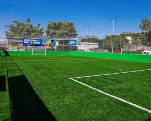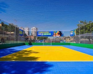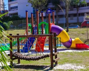 Entre as melhorias implantadas está a instalação de grama sintética, iluminação, piso poliesportivo, playground e academia ao ar livre.