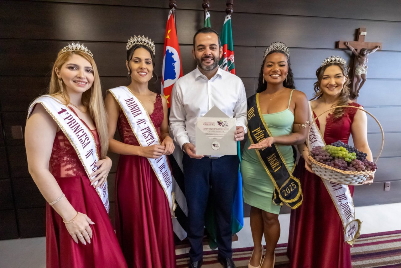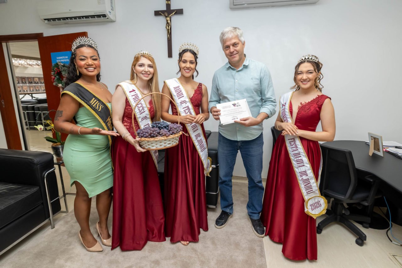 O prefeito Gustavo Martinelli e o vice-prefeito Ricardo Benassi receberam, em seus gabinetes, a Corte da Uva e a Miss Pérola Negra, dando início oficialmente à agenda de visitas aos prefeitos do Aglomerado Urbano da Região de Jundiaí para a divulgação da 41ª Festa da Uva e 12ª Expo Vinhos 2026, o maior e mais tradicional evento do município.