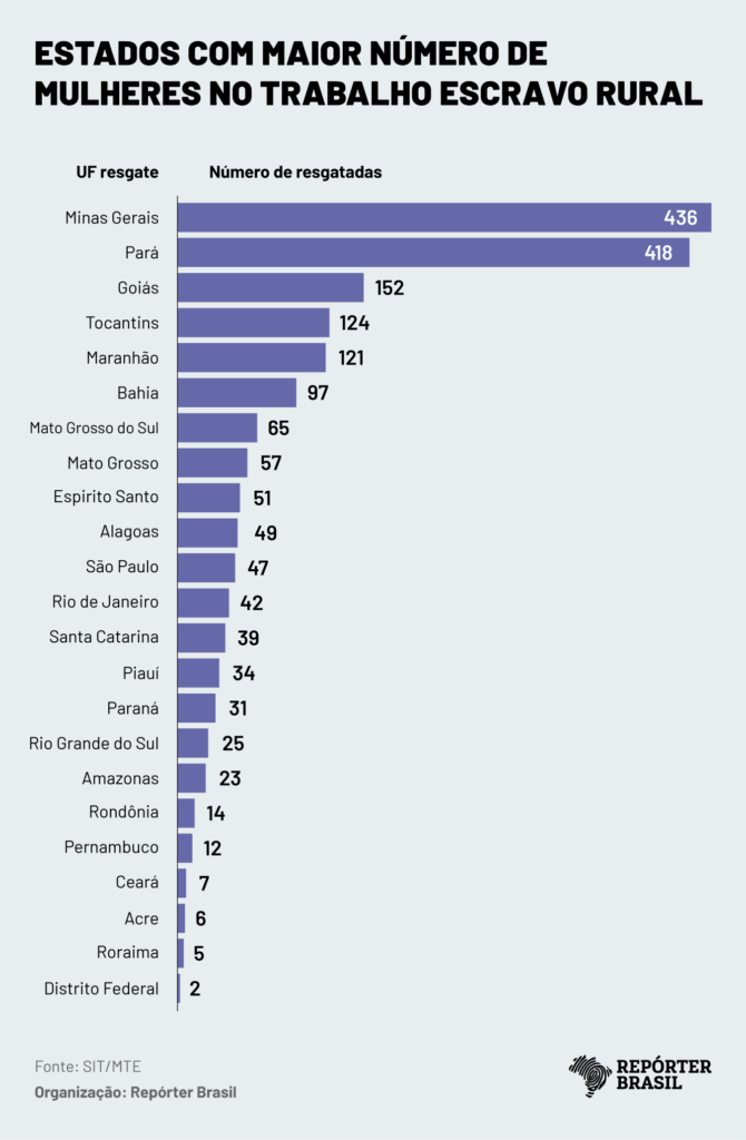 Dados da Contar (Confederação Nacional dos Trabalhadores Assalariados e Assalariadas Rurais) indicam que o Brasil tem cerca de 12 milhões de pessoas em atividade no campo. Cerca de 12% deles são mulheres. Na média dos 21 anos cobertos pelo Projeto Perfil Resgatado, menos de 7% dos trabalhadores rurais resgatados no meio rural brasileiro são do sexo feminino.