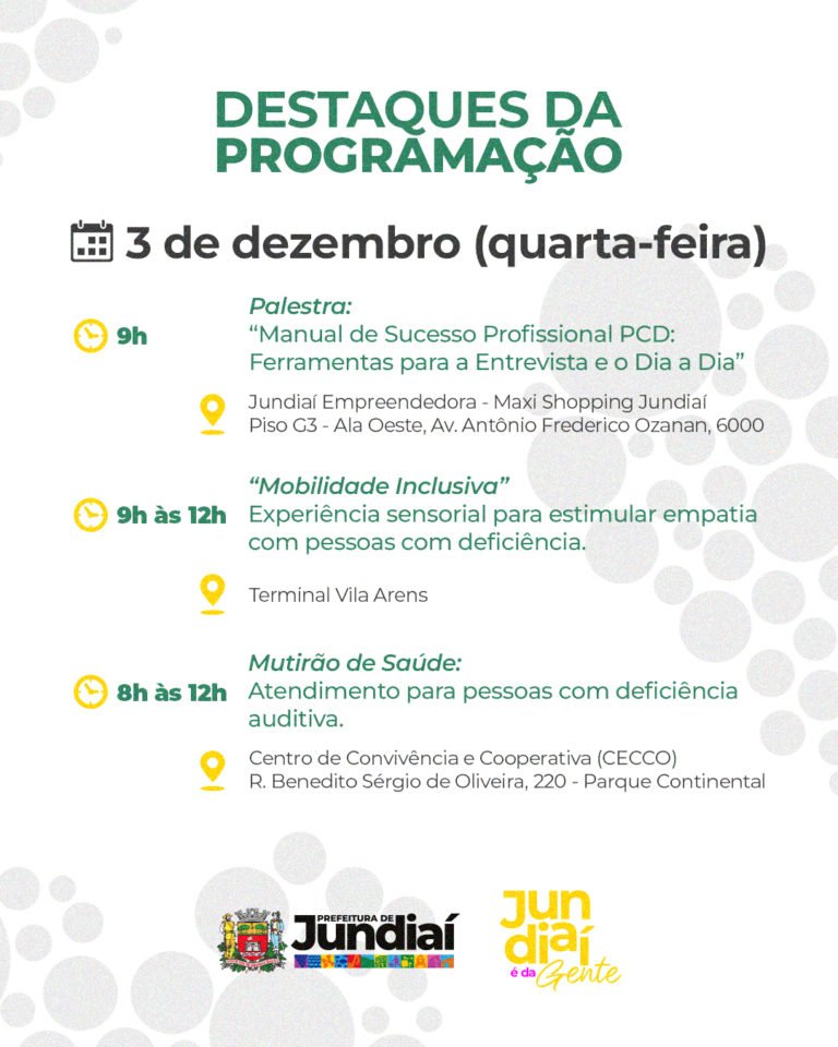 - 1º de dezembro – Cerimônia de abertura e palestra “Deficiência e Cidadania: Como Nosso Atendimento Transforma Vidas” no Paço Municipal.