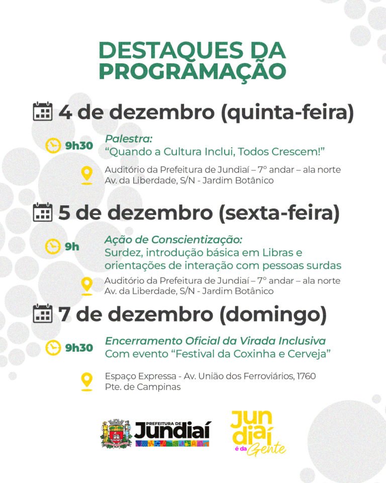 Para reforçar o compromisso de construir uma cidade verdadeiramente acolhedora, plural e acessível, a Prefeitura de Jundiaí, por meio da Secretaria da Casa Civil, do Núcleo de Articulação de Direitos Humanos e da Assessoria de Políticas para a Pessoa com Deficiência, realiza a Virada Inclusiva 2025.