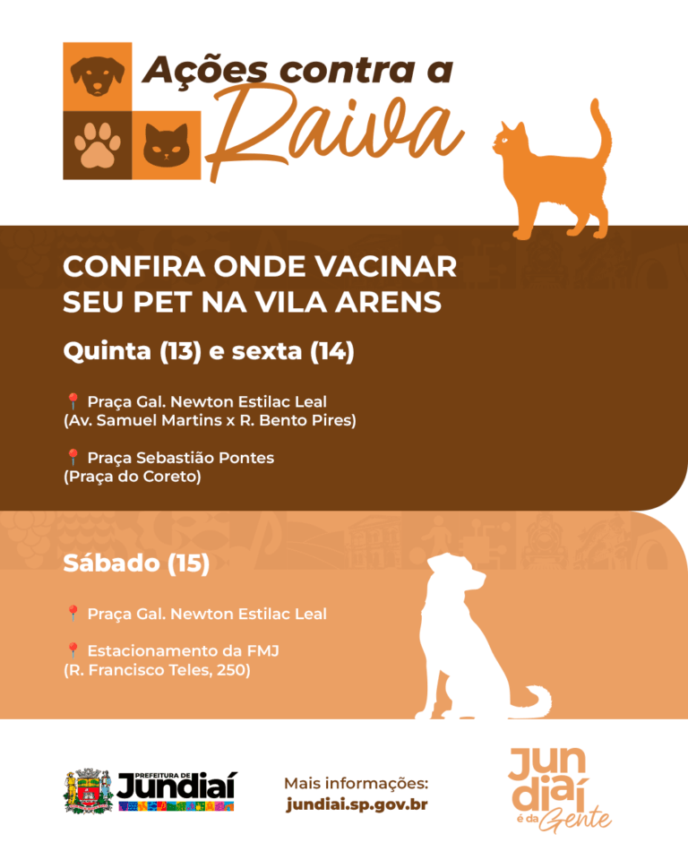 A Praça Sebastião Pontes (Praça do Coreto) e a Praça Gal. Newton Estilac Leal seguem como postos de vacinação avançados para moradores da Vila Arens nesta sexta-feira (14), das 8h30 às 16h30. As ações continuam no sábado (15), na Praça Gal. Newton Estilac Leal e no estacionamento da Faculdade de Medicina de Jundiaí (FMJ).